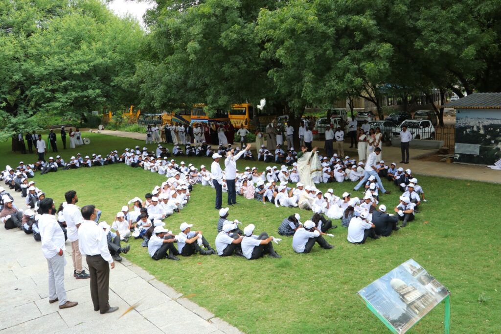 The culmination of the Peace Walk at the tomb of Mohammed Quli Qutub Shah the V, whose reign was the longest, the most peaceful and prosperous was an apt forethought by HIE. Accordingly, the students formed themselves into human contours of the World Peace Day logo. Later Sajjad Shahid a globally recognized historian coordinating restoration and preservation works of the heritage treasures of Hyderabad gave a talk to the students about the importance of preserving heritage monuments and the history of the Seven Tombs and other heritage structures in the complex.