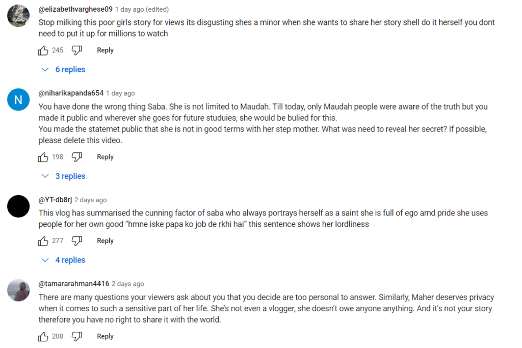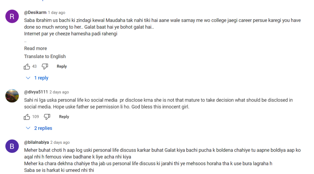 In a recent vlog, Saba Ibrahim went on to reveal some very private information about Meher publicly. In the video she can be heard saying that her followers have been enquiring in the comments section about Meher’s family especially her mother.