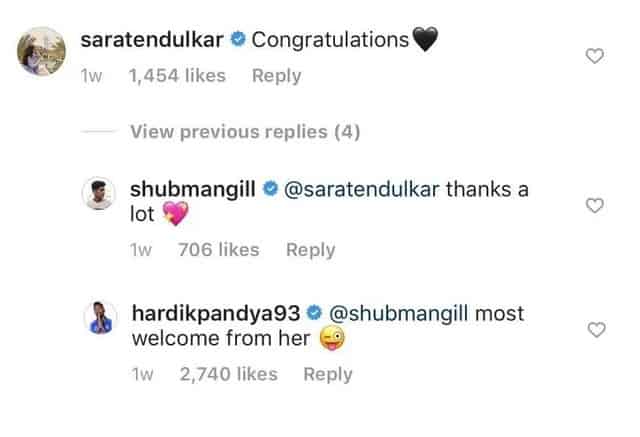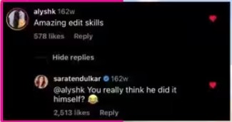 In another screenshot of their old social media interactions, Shubman Gill posted a photo of himself exercising. One fan commented “amazing editing skills”, to which Sara Tendulkar wrote, “you think he did that himself?” giving rise to speculations that she helped out the cricketer with the photo.