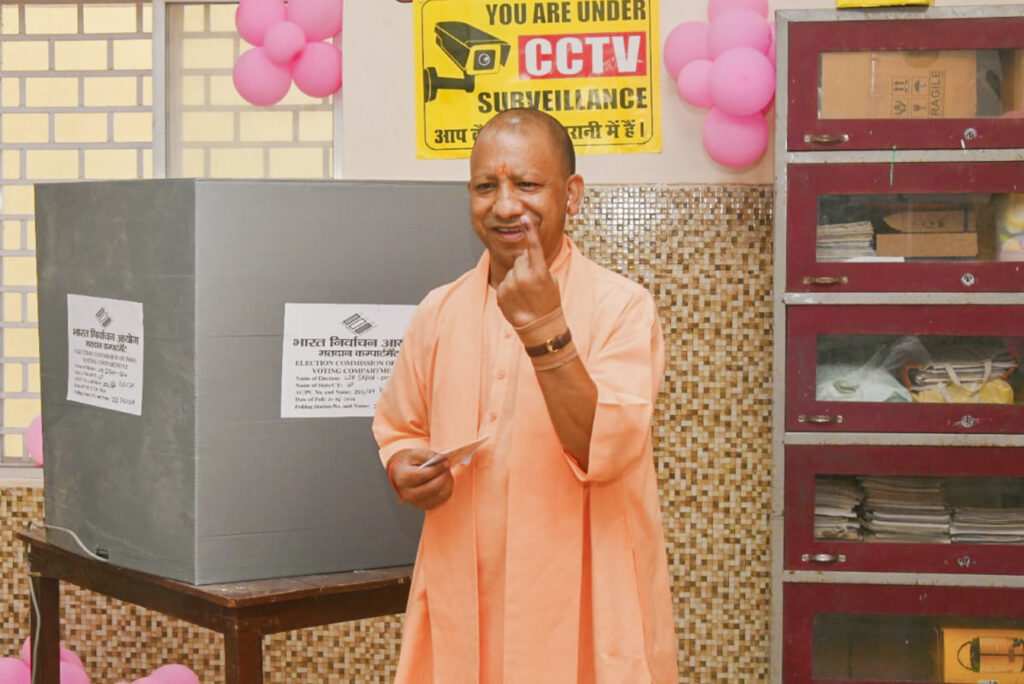 Gorakhpur: Uttar Pradesh Chief Minister Yogi Adityanath show his inked finger after casting his vote at a polling booth during the seventh and last phase of Lok Sabha elections, in Gorakhpur, Saturday, June 1, 2024. (PTI Photo)