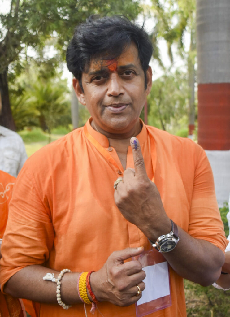 Gorakhpur: BJP leader Ravi Kishan show his inked finger after casting his vote at a polling booth during the seventh and last phase of Lok Sabha elections, in Gorakhpur, Saturday, June 1, 2024. (PTI Photo)