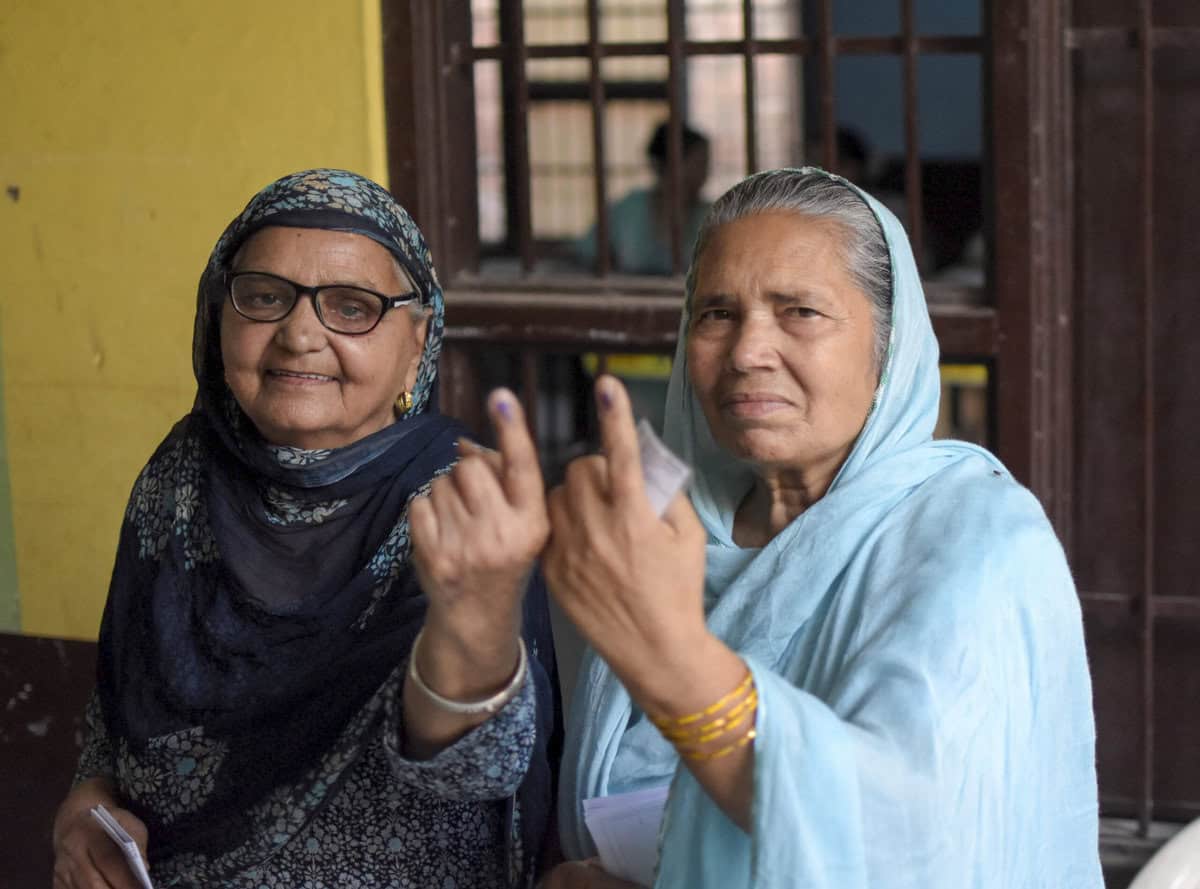 Amritsar: Elderly women show their fingers marked with indelible ink after casting votes at a polling booth during the seventh and last phase of Lok Sabha polls, in Amritsar on Saturday, June 1, 2024. (PTI Photo)
