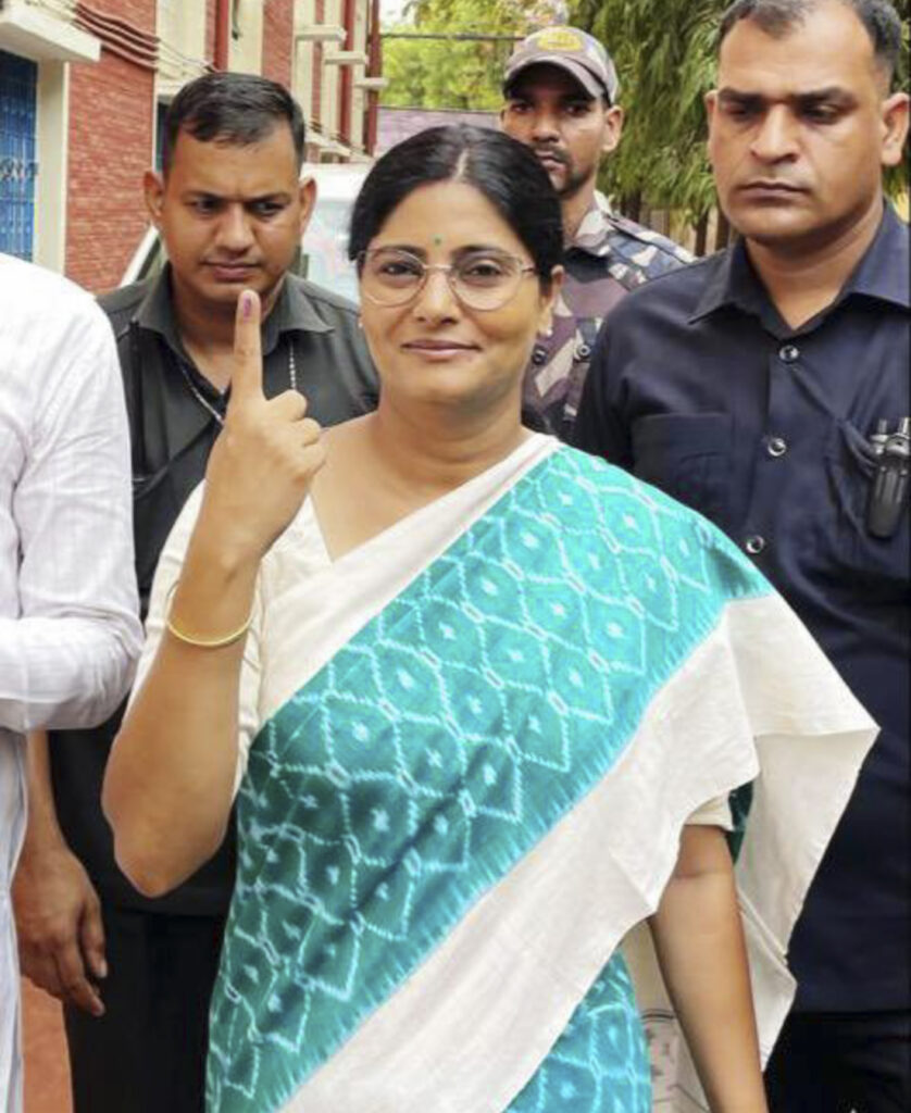 Mirzapur: Apna Dal (Sonelal) leader Anupriya Patel shows her inked finger after casting her vote at a polling booth during the seventh and last phase of Lok Sabha elections, in Mirzapur, Saturday, June 1, 2024. (PTI Photo)