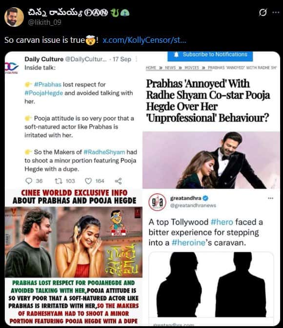 Prabhas is now trending on Google as social media users are linking this unverified quote to old rumors from the sets of Radhe Shyam. In 2021, Great Andhra had reported gossip about a top hero facing an unpleasant situation after entering a heroine’s caravan without permission. No names were mentioned in that report.