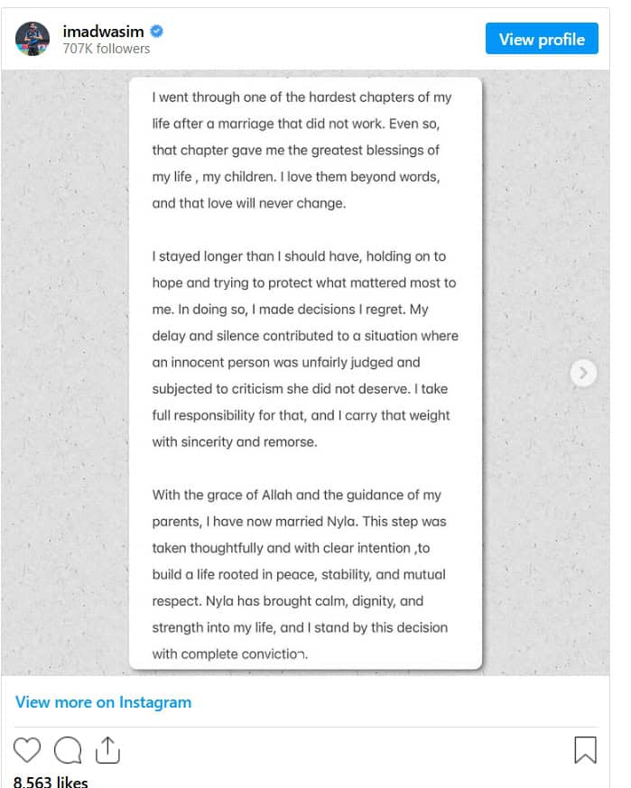 In his official divorce announcement made in December 2025, Imad Wasim had stated that the marriage had ended due to long-standing unresolved conflicts. “After much thought, and due to repeated conflicts that could not be resolved over the past few years, I have filed for divorce,” he wrote, adding that he would continue to care for his children responsibly. He also urged the public to respect both families’ privacy and warned against believing misleading narratives.