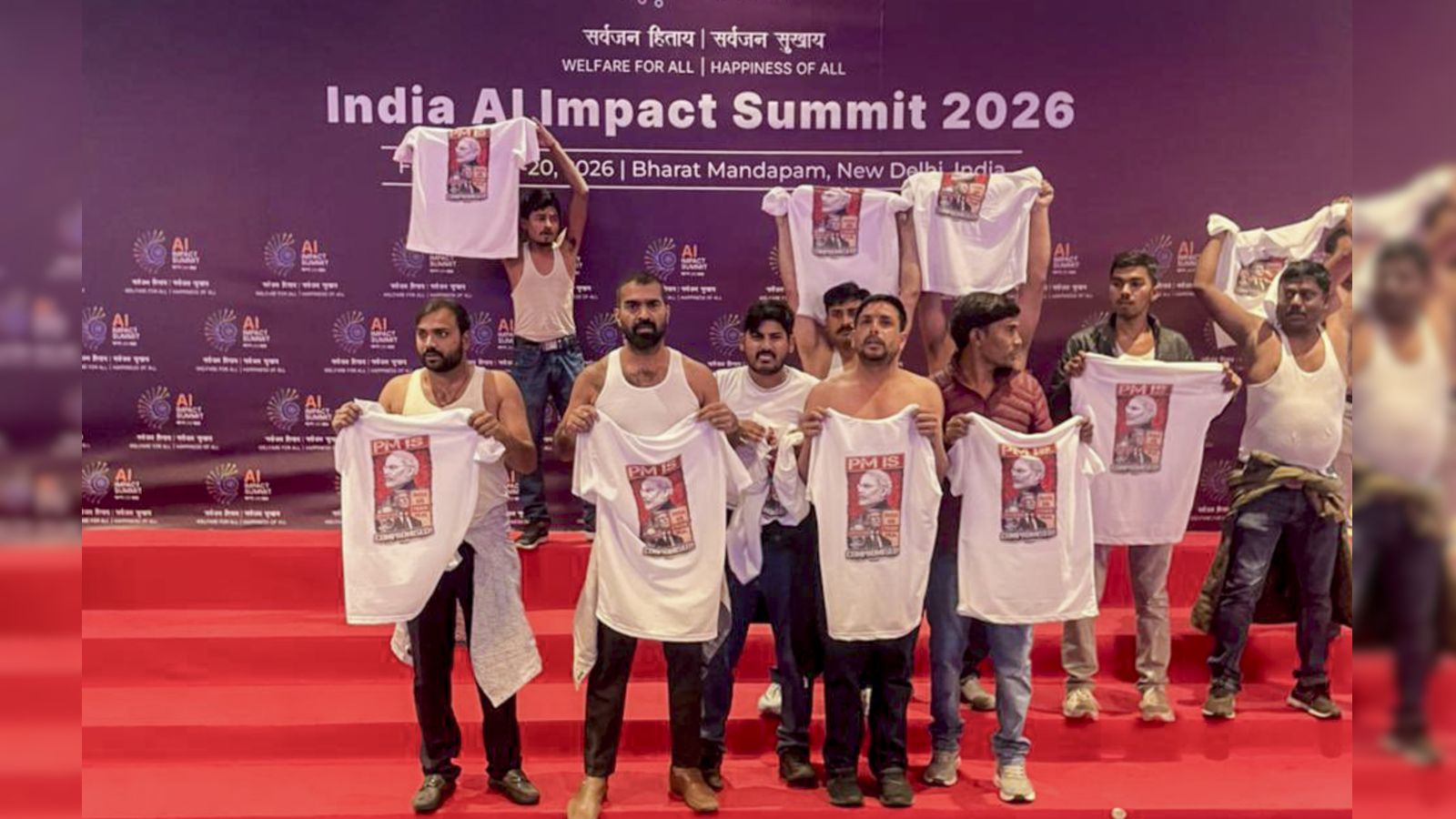 On Friday, a group of IYC workers staged a dramatic protest inside Hall No. 5 of the summit venue by removing their shirts to reveal T-shirts printed with slogans against the government and the India-US interim trade deal, before being whisked away by security personnel.