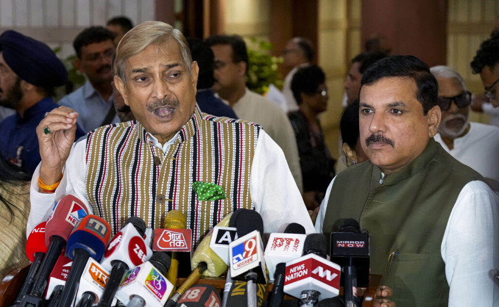 New Delhi: AAP MP Sanjay Singh and Congress MP Pramod Tiwari address the media after an all-party meeting on the eve of the start of Monsoon Session of Parliament, in New Delhi, Wednesday, July 19, 2023. (PTI Photo/Vijay Verma)