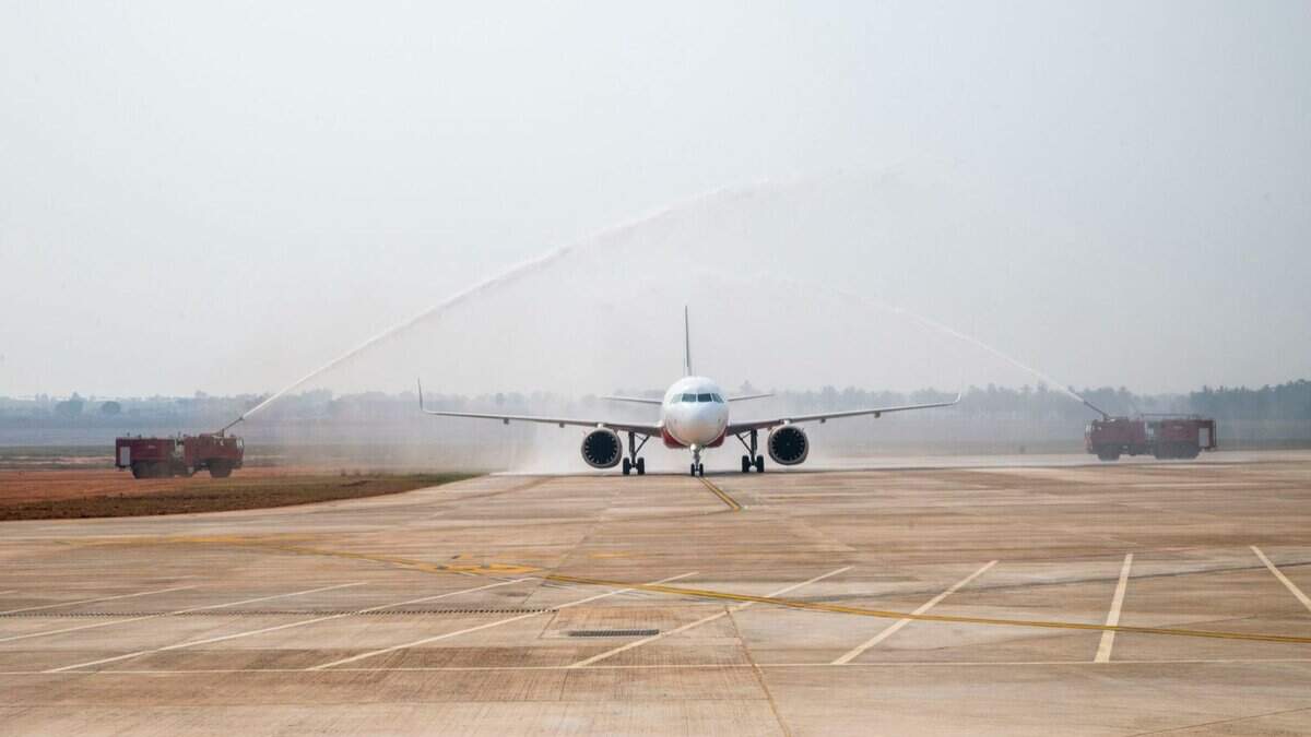 Air India flight from New Delhi was welcomed with ceremonial water cannons as it touched down, completing the first trial run on the 3.8-km runway.