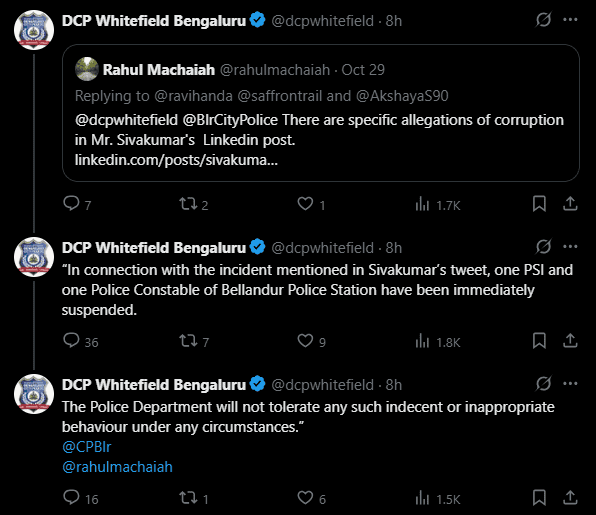 “In connection with the incident mentioned in Sivakumar’s tweet, one PSI and one Police Constable of Bellandur Police Station have been immediately suspended. The Police Department will not tolerate any such indecent or inappropriate behaviour under any circumstances,” the police said.