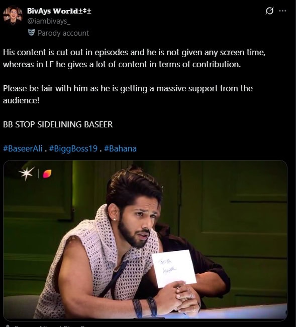 One fan wrote, “We are just asking it loud and clear, we want more screen time of #BaseerAli.” Another said, “Why are makers always ignoring #BaseerAli? If this continues, we’ll stop watching #BiggBoss19!”
