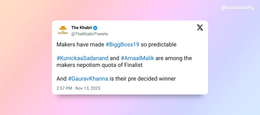 Adding more fuel to the fire, popular social media handle The Khabri made a bold claim on X (formerly Twitter), alleging that the makers already have a pre-decided winner. “Makers have made Bigg Boss 19 so predictable. Kunickaa Sadanand and Amaal Mallik are among the makers’ nepotism quota of finalists. And Gaurav Khanna is their pre-decided winner,” the tweet read.