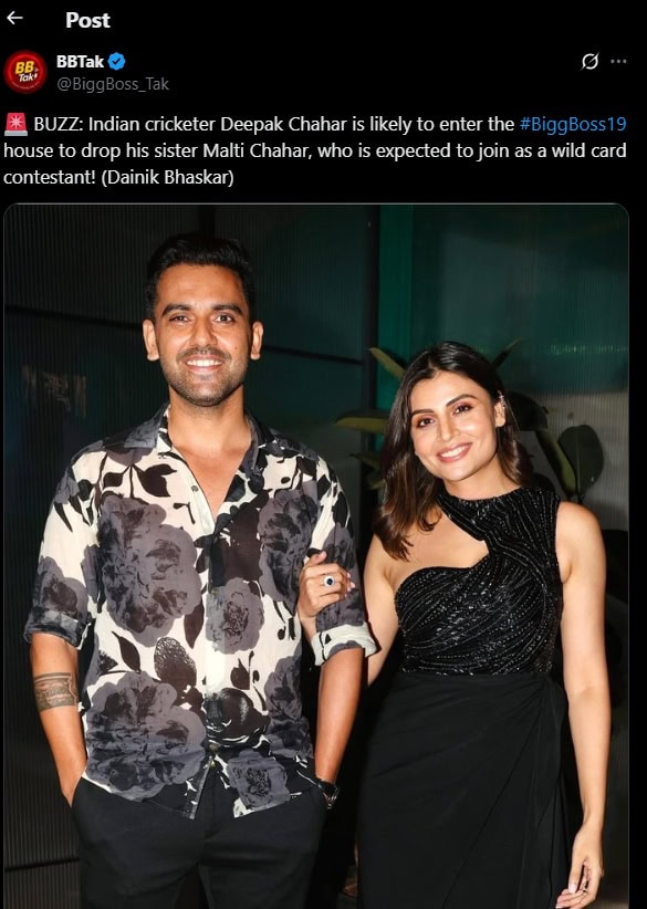 According to latest reports, Indian cricketer Deepak Chahar is likely to make an appearance on Bigg Boss 19 to drop his sister Malti Chahar, who is expected to join the house as a wildcard contestant.