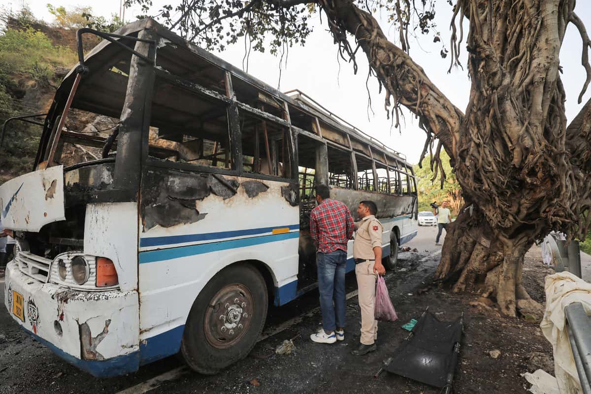 Katra: Police personnel and forensic experts inspect the charred remains of a bus that caught fire on its way from Mata Vaishno Devi Shrine base camp to Jammu, in Katra, Friday, May 13, 2022. At least 4 people died and 20 sustained burn injuries in the fire, according to officials. (PTI Photo)