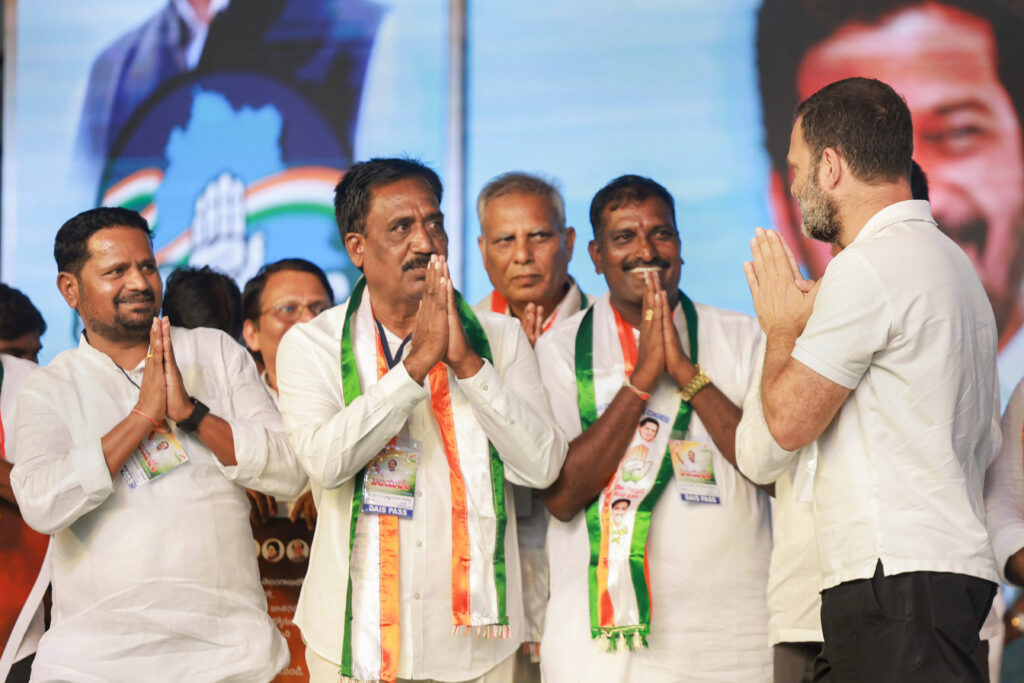 Nagarkurnool: Congress leader Rahul Gandhi being greeted by other party leaders during a public meeting at Kalwakurthy ahead of the upcoming Telangana Assembly election, in Nagarkurnool district, Wednesday, Nov. 1, 2023. (PTI Photo)