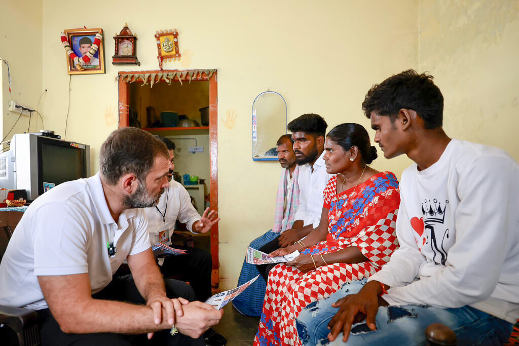 Bhupalpally: Congress leader Rahul Gandhi interacts with Kummari Tirupathamma whose husband Chandraiah committed suicide due to farm loan at her Jillea village in Bhupalpally district, Wednesday, Nov. 1, 2023. (PTI Photo)