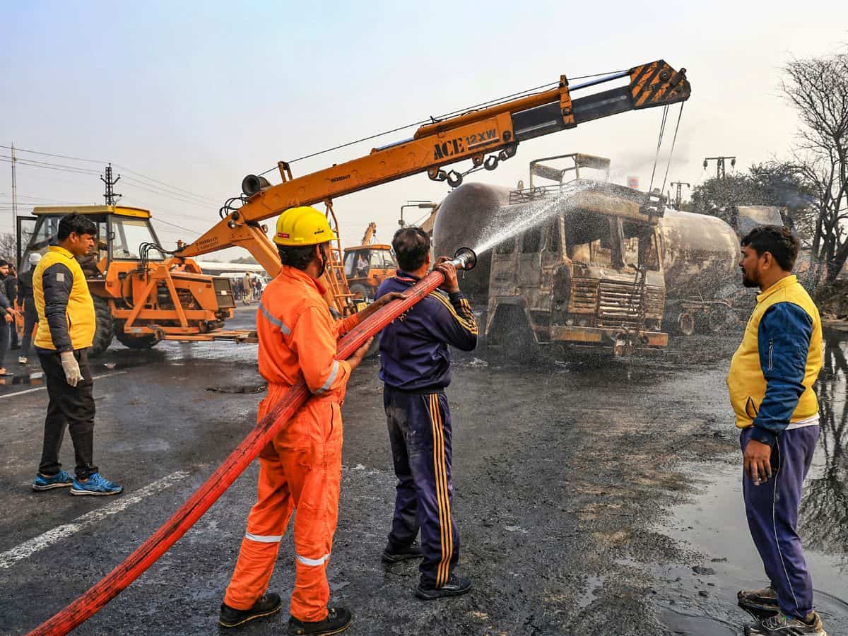 A truck hit the LPG tanker on the highway in the Bhankrota area in the early hours of Friday, sparking a massive fire that engulfed more than 35 vehicles.