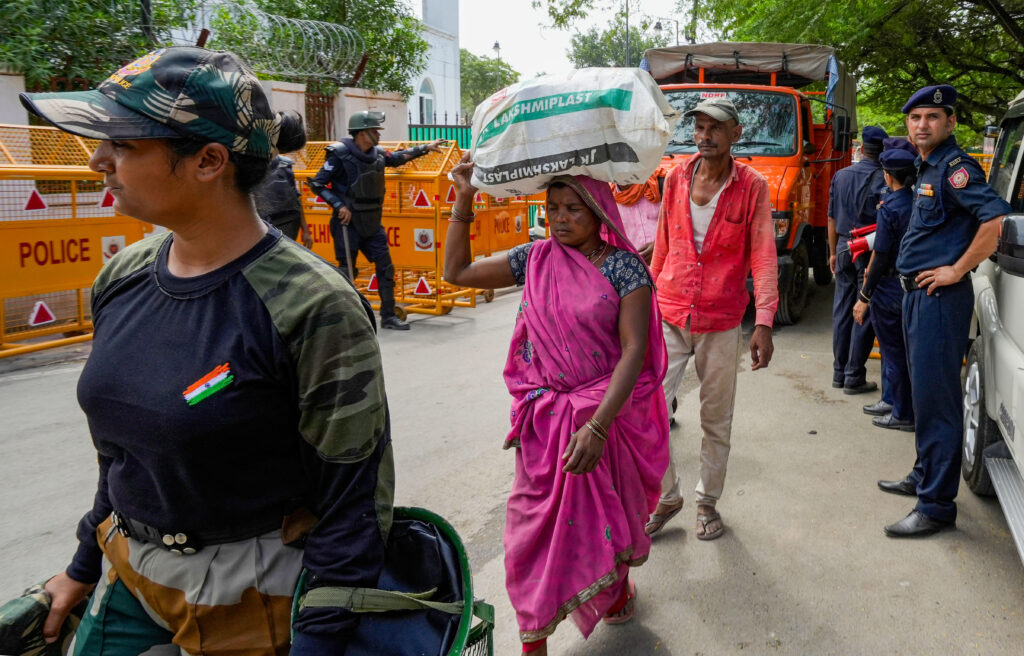 New Delhi: Security personnel deployed during a demolition drive at Priyanka Gandhi Camp, a slum cluster in Vasant Vihar, in New Delhi, Friday, June 16, 2023. (PTI Photo/Kamal Singh)