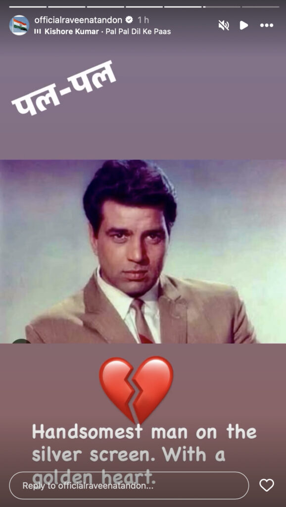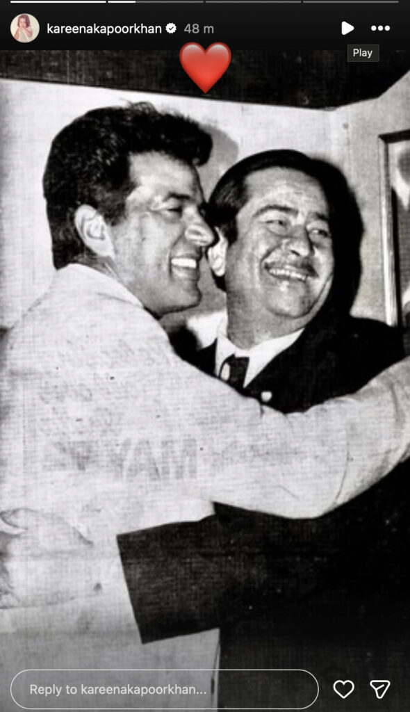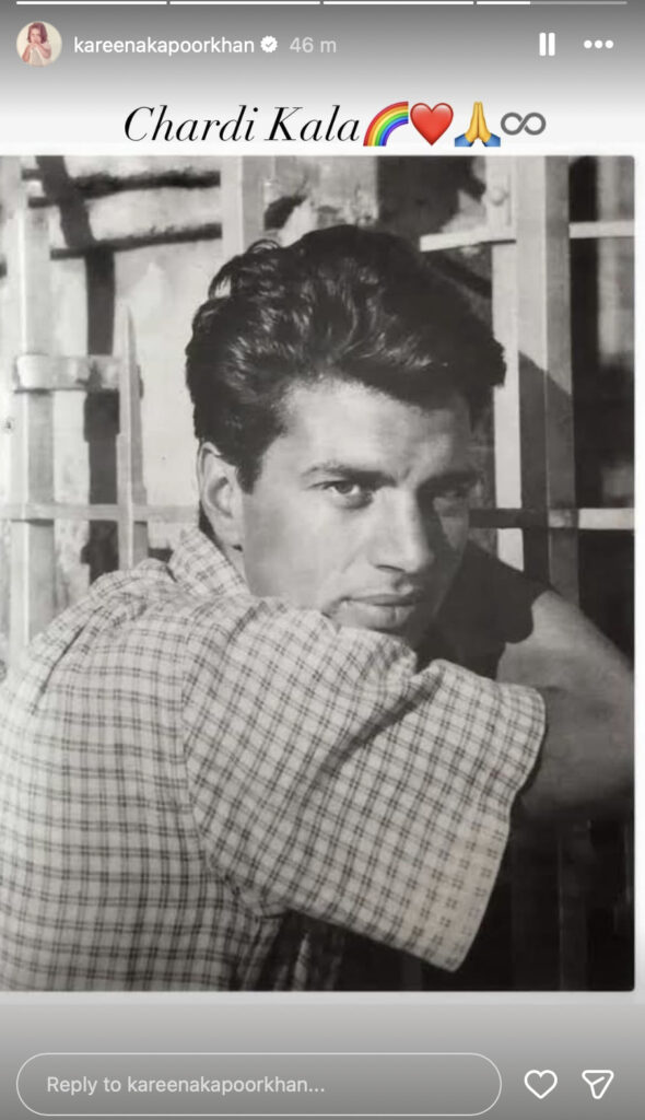 Kareena Kapoor Khan shared two black and white photos on her Instagram stories. The first featured a young Dharmendra, which she captioned with “Chardi Kala” and heart and prayer emojis. She then shared a happy picture of Dharmendra and Raj Kapoor greeting each other with big smiles. For the caption, she wrote, “Forever in power.”