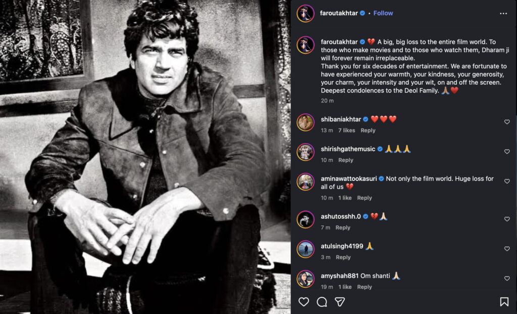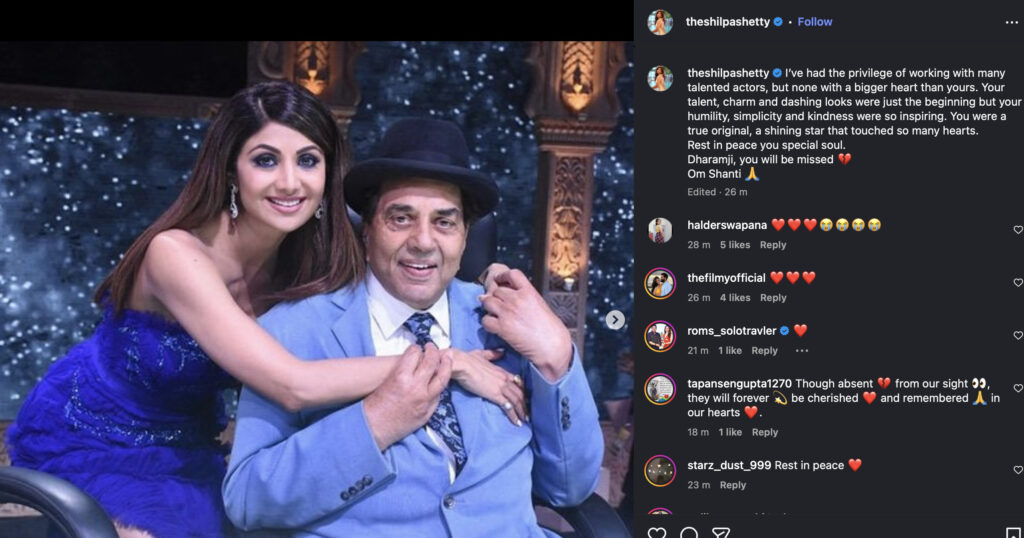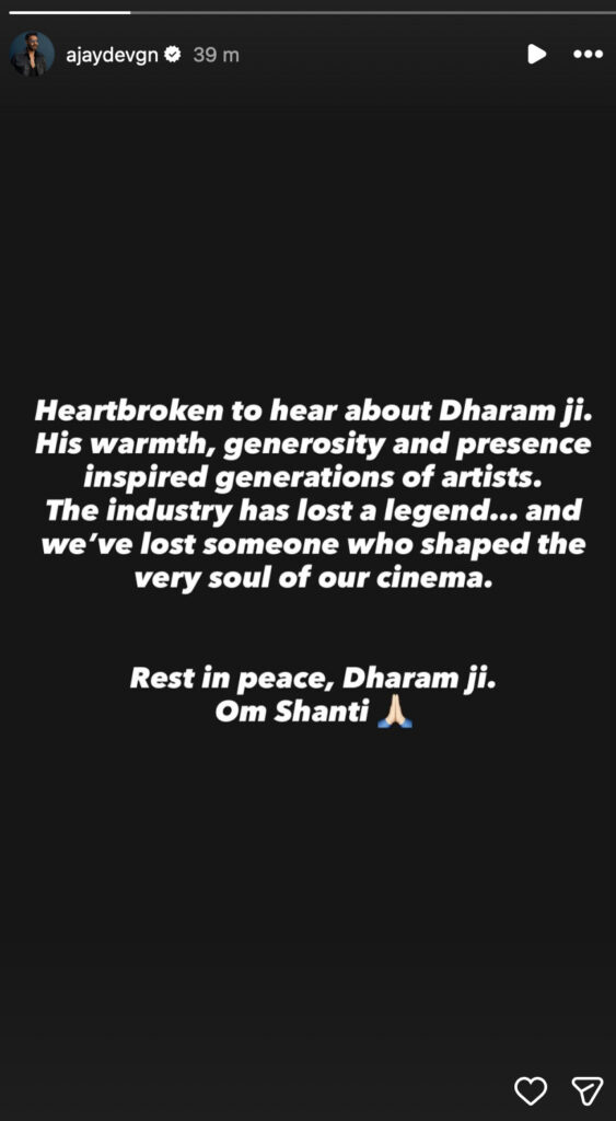 Actress Kajol also shared a heartfelt message on Instagram. She wrote, “The OG of the Good Man is gone and the world is poorer for it. Somehow it seems like we are only losing the good people in it. Kind to the core and loved always. RIP Dharamji, with love always.” Her words reflect the deep respect the industry had for him.