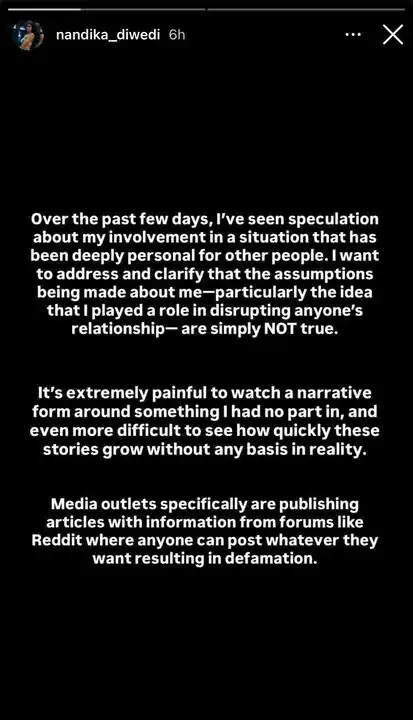 She wrote, “Over the past few days, I’ve seen speculation about my involvement in a situation that has been deeply personal for other people. I want to address and clarify that the assumptions being made about me, particularly the idea that I played a role in disrupting anyone’s relationship, are simply NOT true. It’s extremely painful to watch a narrative form around something I had no part in, and even more difficult to see how quickly these stories grow without any basis in reality.”