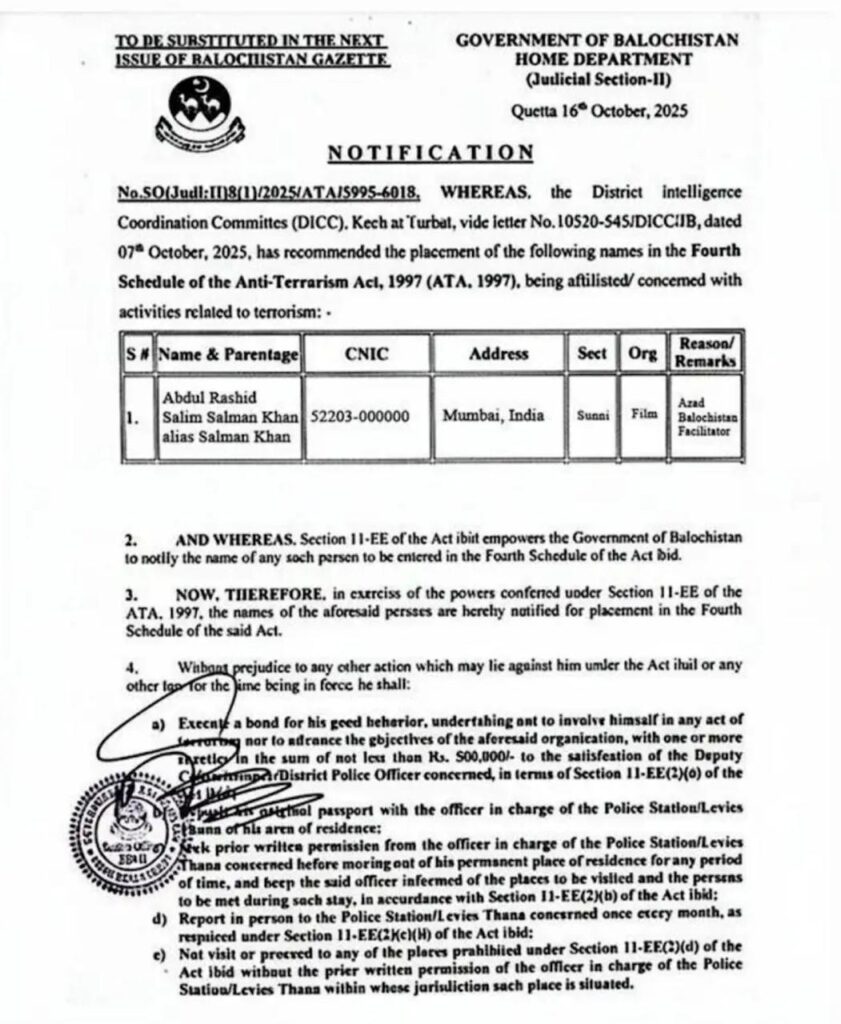 Multiple media platforms and social media users have circulated a document allegedly issued by the “Government of Balochistan” on October 16, 2025. It states that Salman Khan is being added to Pakistan’s Anti-Terrorism Act’s Fourth Schedule as an “Azad Balochistan Facilitator.” The claim quickly went viral, with even some news outlets reporting that Pakistan had officially blacklisted the actor.