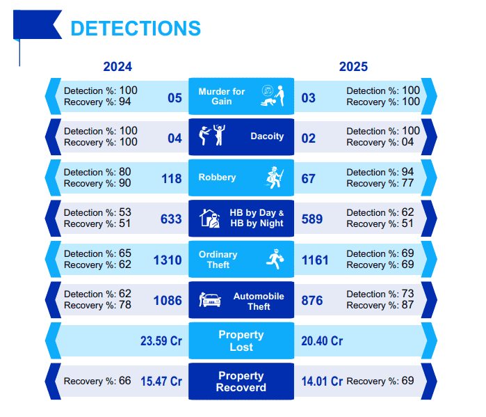 Robbery cases decreased from 118 in 2024 to 67 in 2025. “It was also recorded that property losses amounted to Rs 20.40 crore in 2025, while Rs 14.01 crore worth of stolen property was recovered.