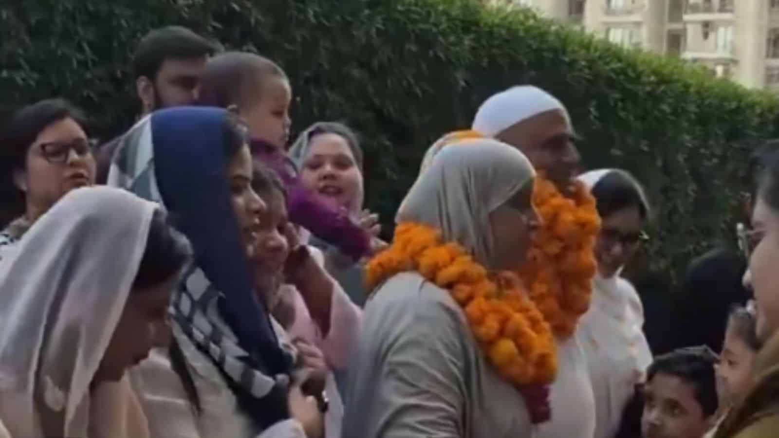 A video of the act surfaced on social media, showing Hindu members offering flower garlands amid cheers as the couple departed for the airport for Haj 2026.