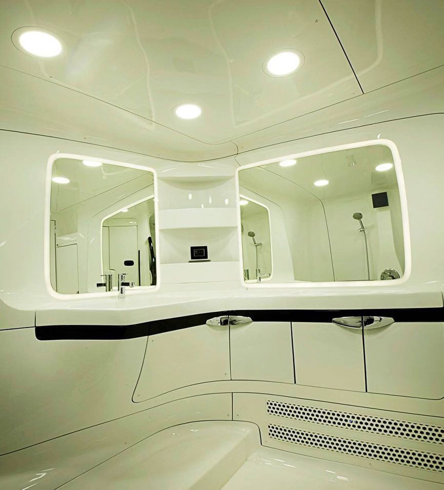 The vanity van is a highly customised Volvo BR9, often referred to as Zion Wheels within film circles. One of its most eye-catching features is its fully glass floor, which is backlit to create a sleek and modern look. The roof is finished with wooden panels, adding warmth to the interiors.