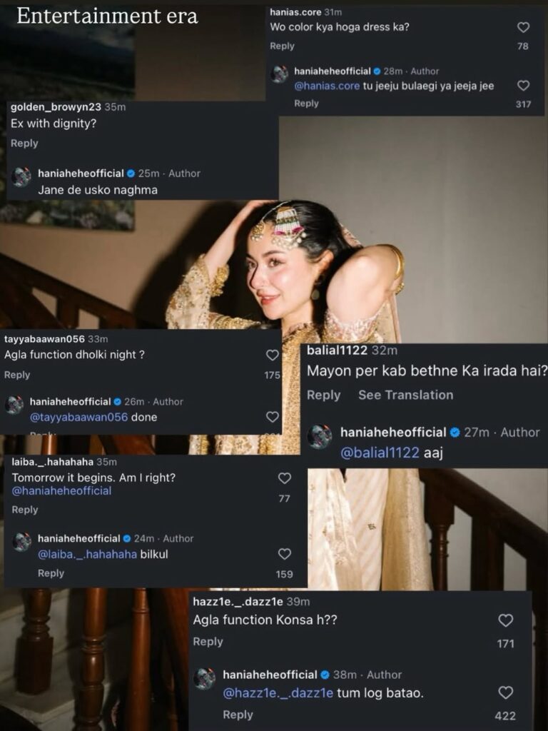 However, the internet went into overdrive after Hania responded to fan comments on her latest Instagram post. When one fan asked, “Agla function dholki night?” she replied, “Done.” Another comment read, “Tomorrow it begins, right?” to which the actress responded, “Bilkul.” In yet another exchange, a fan asked about her mayon ceremony, and Hania replied, “Aaj.”