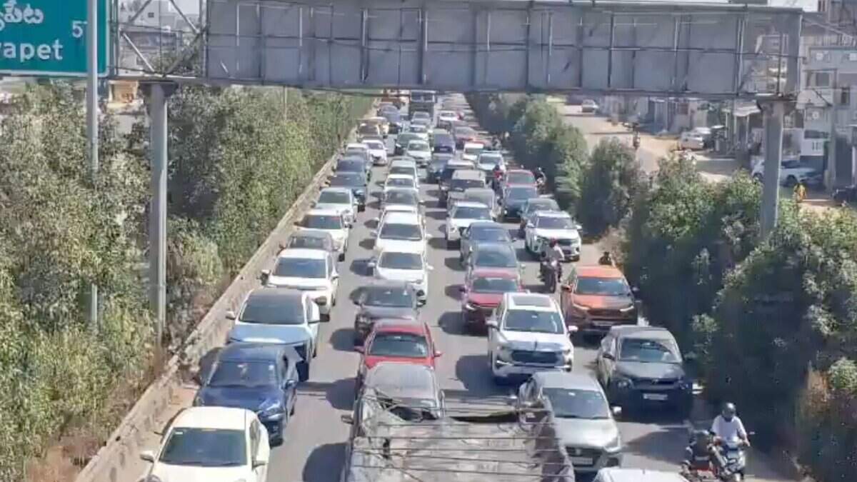 Traffic movement slowed significantly since early this morning due to the surge in vehicles heading towards Hyderabad. Many vehicles are lined up in queues at Chityala