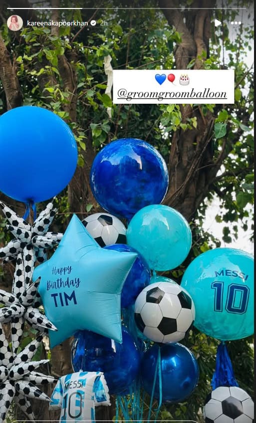 Taking to her Instagram Stories, the ‘Jab We Met’ actress gave a peek into Taimur’s Lionel Messi–themed birthday celebration. Kareena posted a photo that showcased the football-inspired décor and the special touches that made the day extra memorable. The picture featured blue and white balloons with “Happy Birthday Tim” written on them, while another balloon had “Messi 10” printed on it.