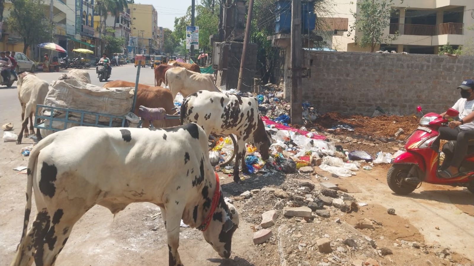 The garbage lies on the road near the police station, leading to a foul smell. Several cattle are attracted due to its presence, compounding the problem.