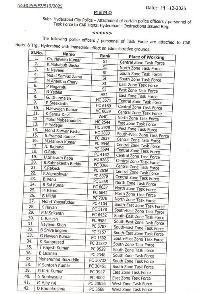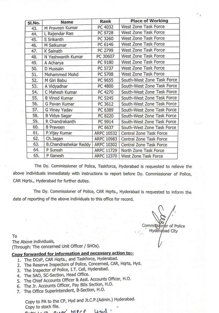 Hyderabad: Sixty-five policemen working in different ranks with the Hyderabad Commissioner’s Task Force were transferred and attached to the CAR Headquarters by Hyderabad CP, VC Sajjanar, on Friday.