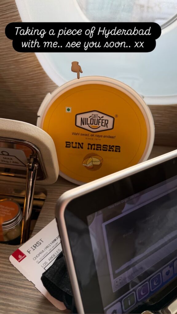 During her recent stay in Hyderabad, Priyanka shared glimpses of her shoot schedule and moments from the city on social media. As she wrapped up her shoot and headed back to Los Angeles, the actor made sure to carry a piece of Hyderabad with her, Cafe Niloufer’s iconic Bun Maska.
