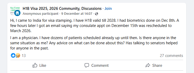 On a Facebook group dedicated to H-1B visa issues, a physician posted that their December appointment was also pushed till March next year, and even wondered if it was worth appealing to US Senators.