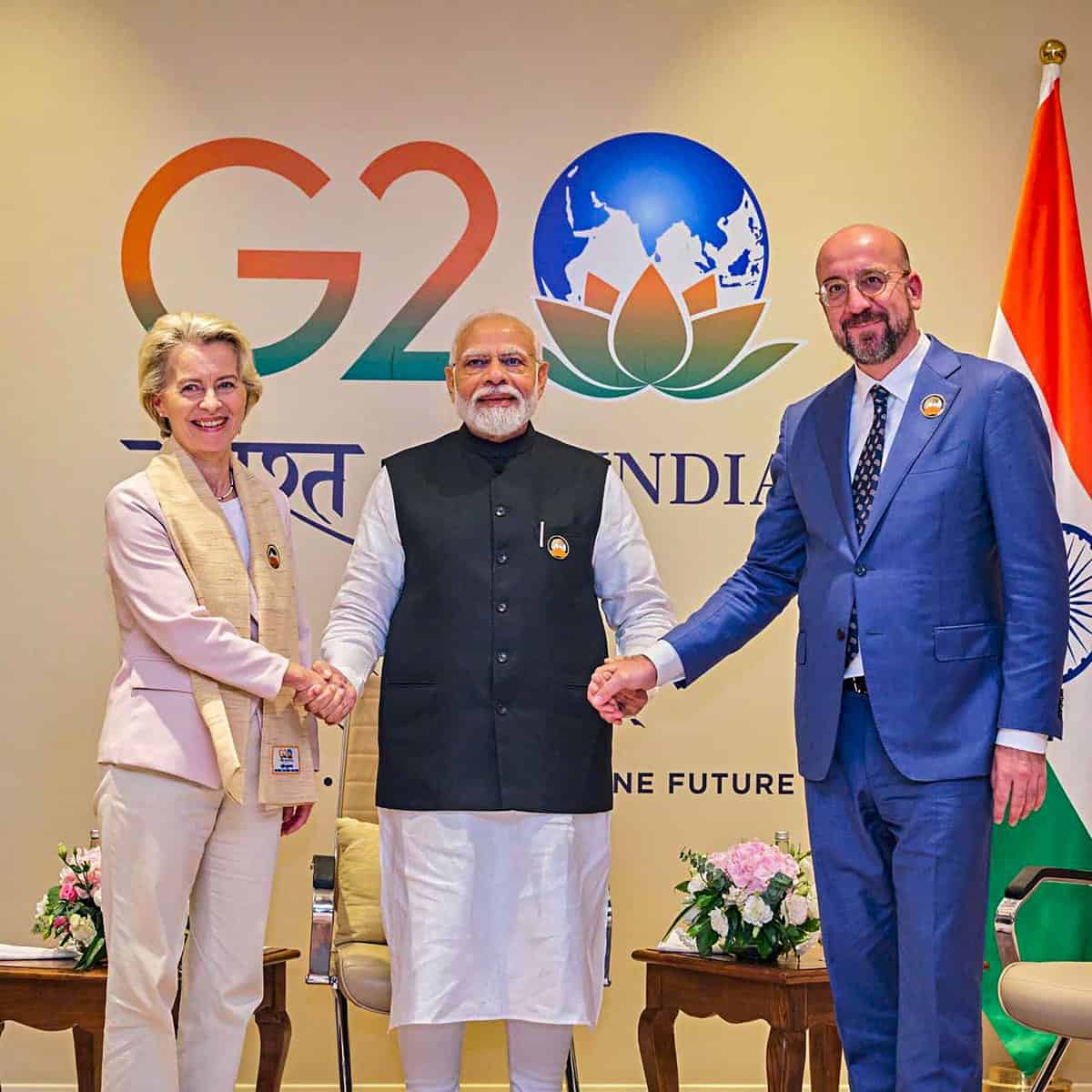 New Delhi: Prime Minister Narendra Modi with President of European Commission Ursula von der Leyen and President of European Council Charles Michel during a meeting on the sidelines of the G20 Summit, in New Delhi, Sunday, Sept. 10, 2023. (PTI Photo)