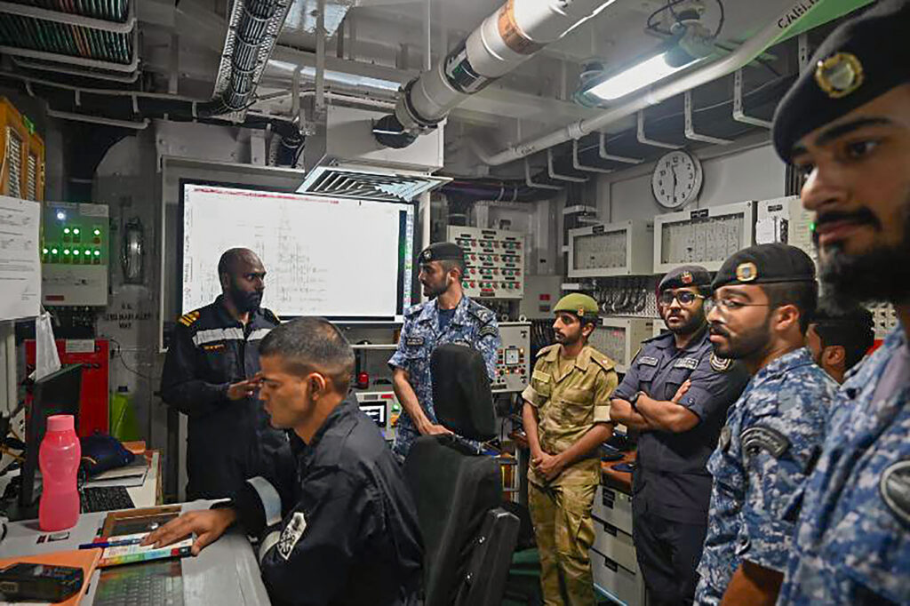 Indian Navy personnel during port call professional interactions with Royal Bahrain Naval Force (RBNF) in various domains of maritime operations in Bahrain, Monday, Aug 21, 2023. (PTI Photo)