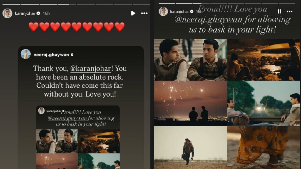 Karan Johar, who produced the film, shared a collage from the movie on his Instagram Stories and wrote , “Proud!!!! Love you @neeraj.ghaywan for allowing us to bask in your light!”