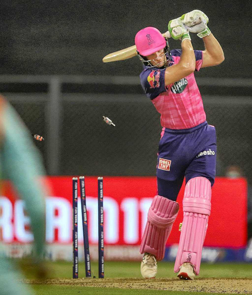 Mumbai: Jos Buttler of Rajasthan Royals being bowled during match 20 of the Indian Premier League 2022 cricket tournament between the Rajasthan Royals and the Lucknow Super Giants, at the Wankhede Stadium in Mumbai, Sunday, April 10, 2022. (Sportzpics for IPL/PTI Photo)