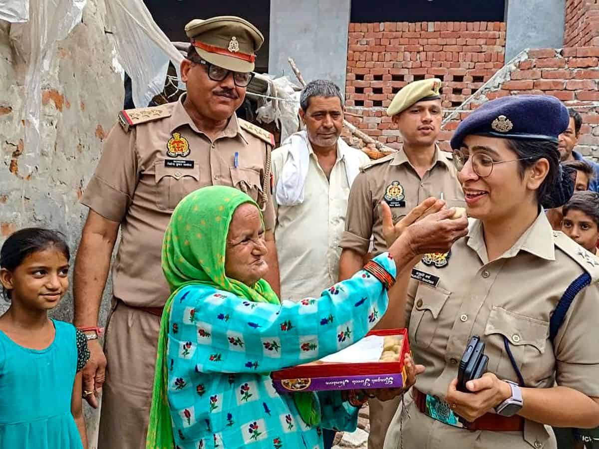 The police personnel and Noorjahan also exchanged sweets on the occasion. Sharma even switched on the fan and showed the elderly woman how to operate it.