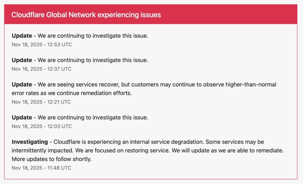 Issues with web infrastructure company Cloudflare triggered a massive outage for services such as X, ChatGPT, Canva and thousands of other sites on Tuesday, November 18.