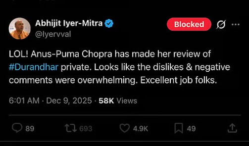 “Dhurandhar is an exhausting, relentless, and frenzied espionage thriller propelled by charismatic, murderous men, too much testosterone, shrill nationalism, and inflammatory anti-Pakistan narrative,” read her review reportedly. Chopra, who also serves as the chairperson of the FCG, received intense hate comments on her review, with even high-profile people condemning her review.