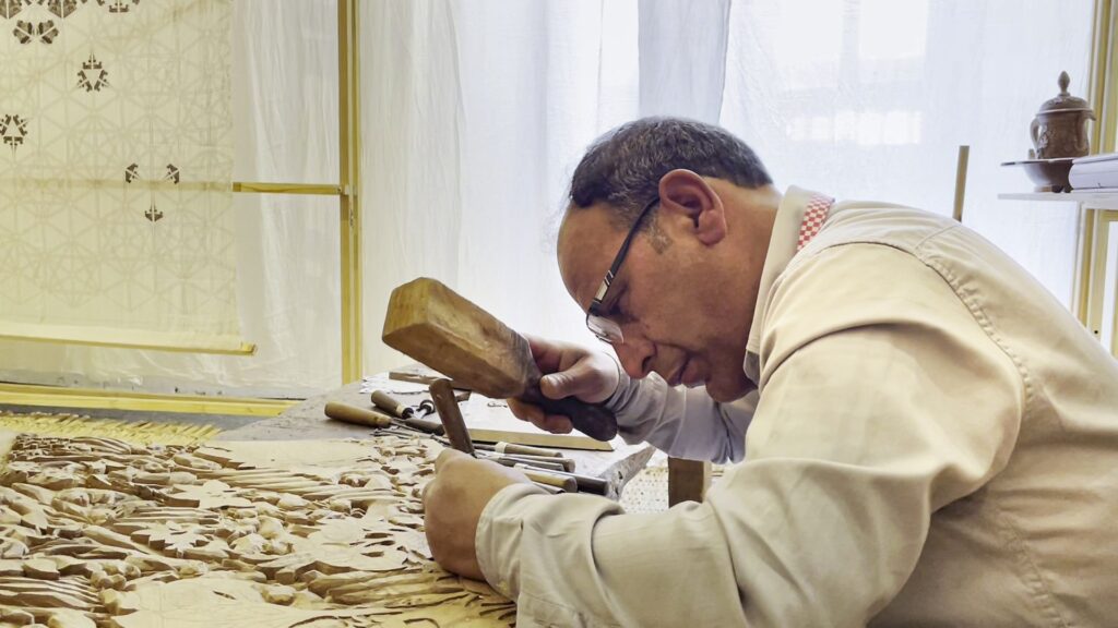 Stepping inside, one is transported to a world of handheld tools carving intricate details on walnut wood, splitting willow reeds and turning them into baskets, painting microscopic flora on papier mache boxes, and turning hard copper into jewellery and utensils.