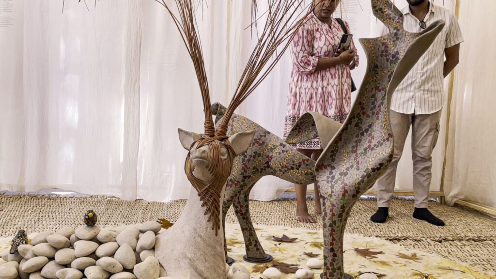 Designer Sandeep Sangaru’s curation, titled “Hands, Tools, and the Living Thread: From Kashmiri Craft Ateliers”, at the 10th Serendipity Arts Festival celebrates the traditional crafts from the valley, featuring six artisans and one designer to showcase the art of “Traam kaam” (copper craft), “Dhung chok saaz” (walnut wood carving), “Kari Kalamdani” (painting), “Shakta saaz” (papier mache), “Namda” (hand-felted wool rug), and “Kani kaam” (willow wicker).