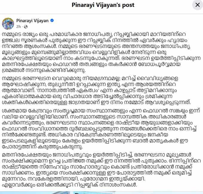 Extending Republic Day greetings, Vijayan said in a Facebook post that the day renewed the proud memories of India becoming a sovereign, democratic republic, even as conscious attempts were being made to undermine the principles of secularism and federalism enshrined in the Constitution.