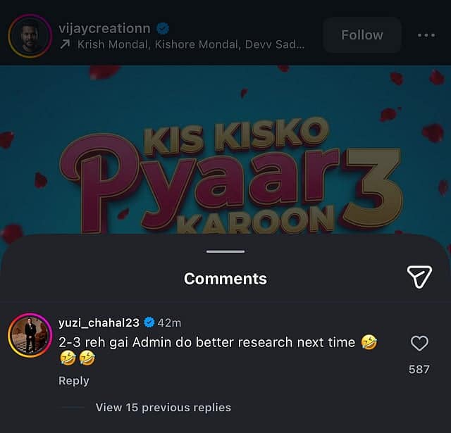 Instead of ignoring the posts, Chahal reacted with humour. He commented, “2-3 reh gai admin, do better research next time,” suggesting that a few more names were missing from the fictional list. His comment quickly went viral, with fans praising his calm and witty response. After this, the creator reportedly deleted the posters and uploaded revised visuals featuring only Chahal.