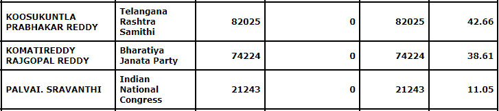 The by-poll was necessitated after sitting MLA Komatireddy Rajagopal Reddy resigned from the Congress to join the BJP in August.