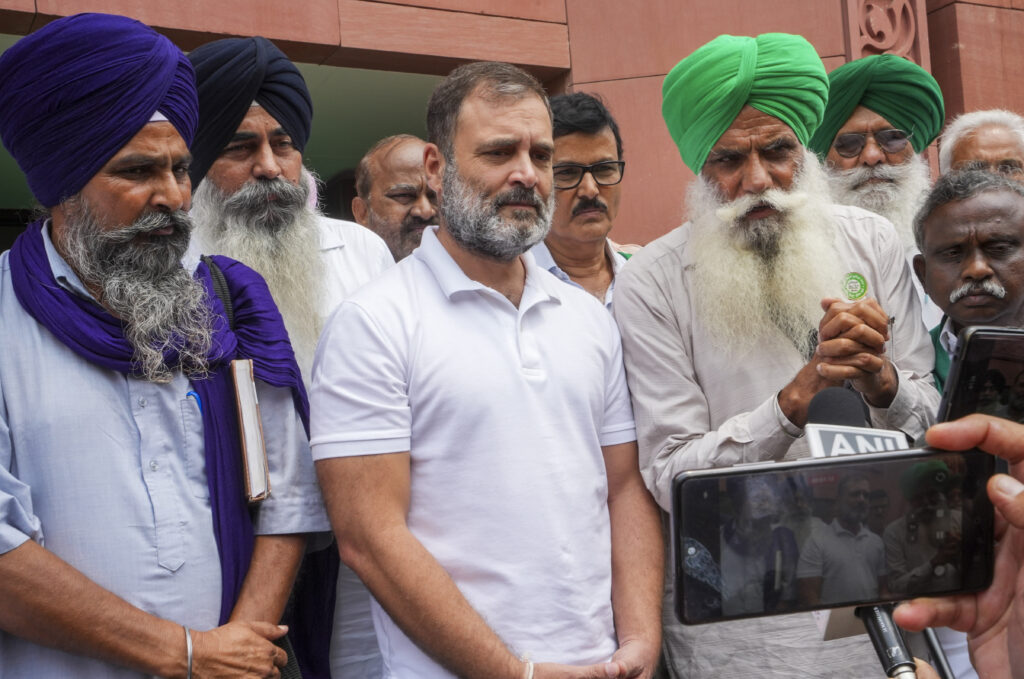 New Delhi: Leader of Opposition in Lok Sabha and Congress MP Rahul Gandhi along with farmer leaders speaks to the media at the Parliament House, in New Delhi, Wednesday, July 24, 2024. (PTI Photo/Manvender Vashist Lav)