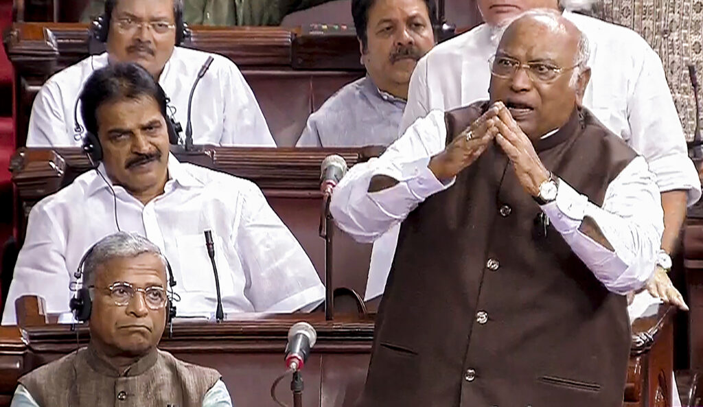 New Delhi: Leader of Opposition in Rajya Sabha Mallikarjun Kharge speaks in House during the Monsoon session of Parliament, in New Delhi, Friday, Aug. 4, 2023. (PTI Photo)