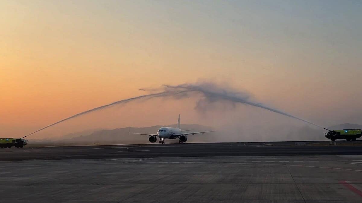 The aircraft was accorded a ceremonial water cannon salute on arrival, a time-honoured aviation tradition marking NMIA’s first commercial touchdown and departure, the airport operator said in a statement.